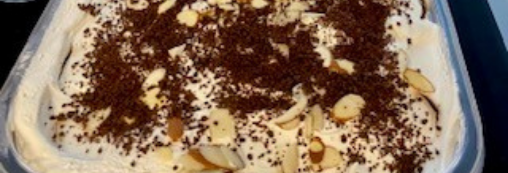 In a food processor pulse the 6-8 cookies until you have coarse crumbs. Before serving, sprinkle the coarse crumbs and sliced almonds over the top. Spoon ice box cake into bowls and serve chilled.